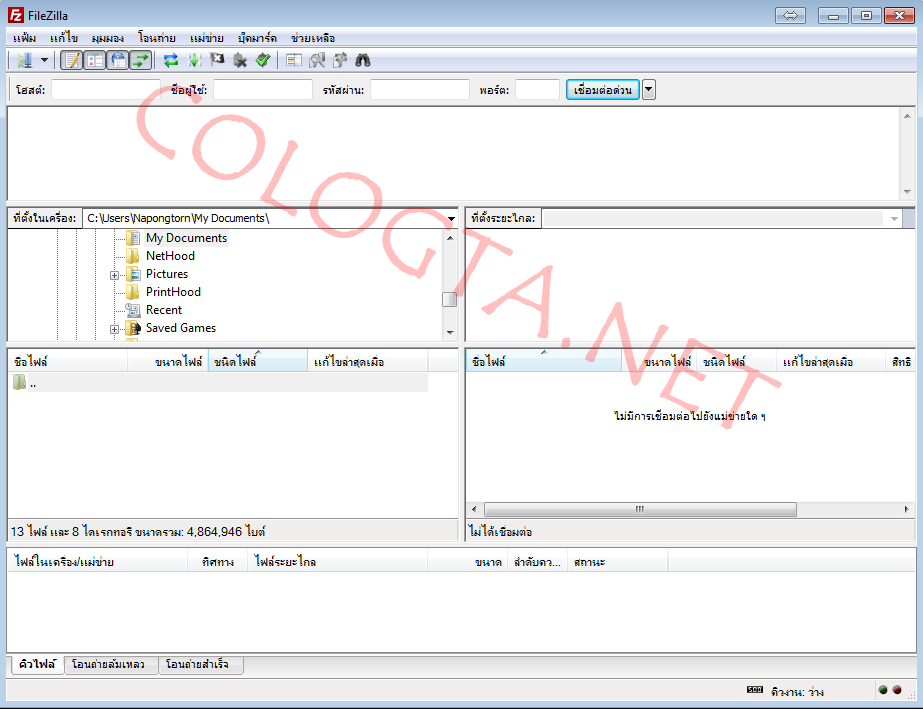 2. หลังจากเชื่อมต่อ FTP เซิร์ฟเวอร์เรียบร้อยแล้ว โปรแกรมจะแสดงไดเรคทอรี่ภายในเว็บเซิร์ฟเวอร์ที่ช่องขวามือ (ในรูปภาพนี้ไม่มีโฟลเดอร์ย่อยจึงเห็นเป็นช่องเปล่า)